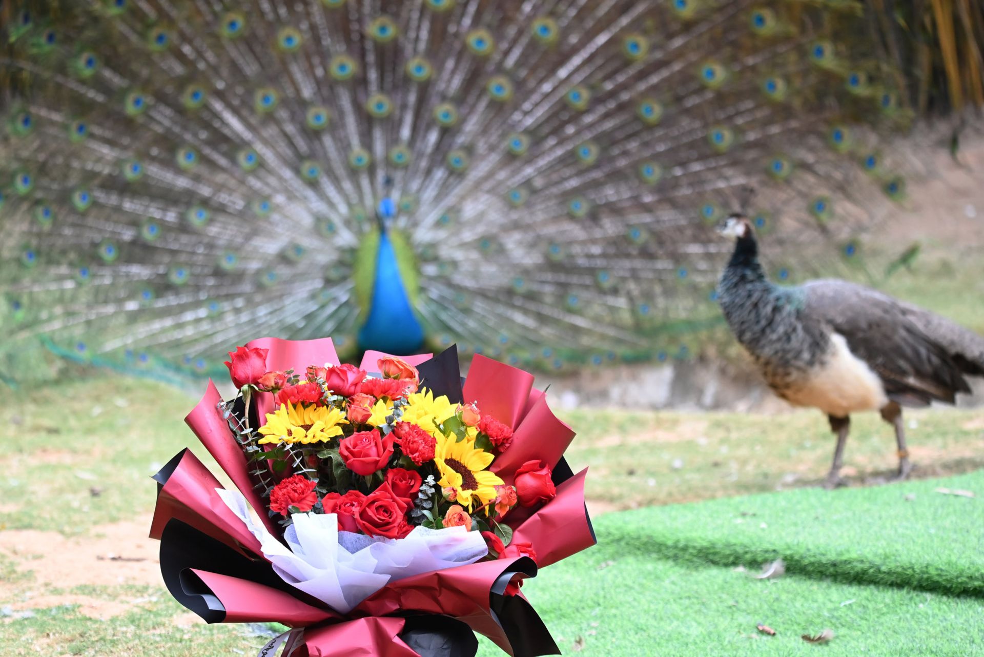 孔雀正值求偶时节,雄孔雀为求得雌孔雀的“芳心”,争相开屏。当雄孔雀开屏遇上鲜花,构成美丽又有趣的画面。