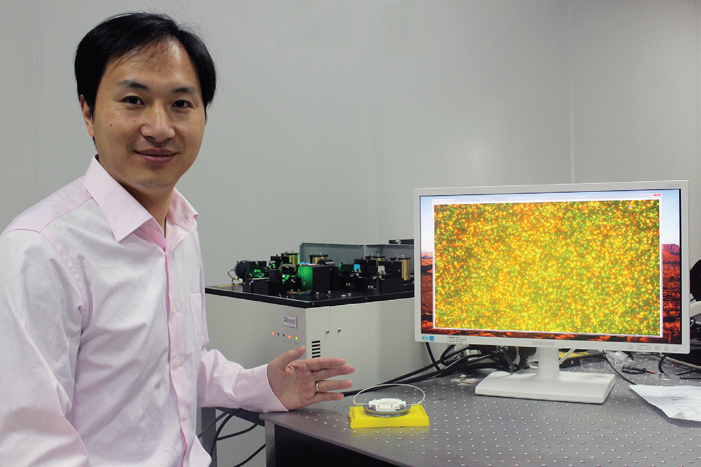 贺建奎和GenoCare测序仪。图中绿色和黄色点代表核酸单色荧光标签,每个点代表一个单分子。