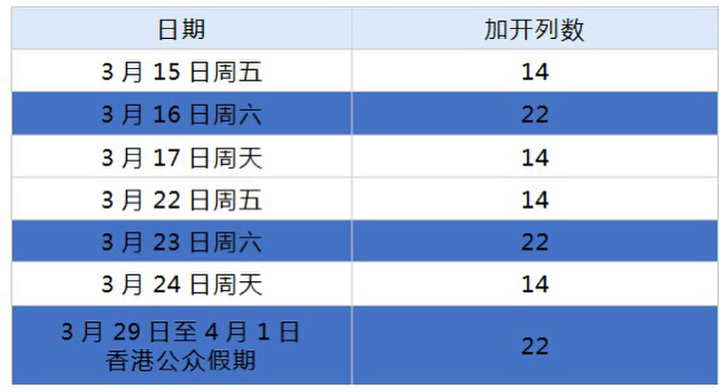 据了解,3月15日、17日、22日、24日,福田站往返香港西九龙站每天将加开14趟高铁;3月16日、23日(周六)及3月29日至4月1日(香港公众假期),福田站往返香港西九龙站每天将加开22趟高铁。