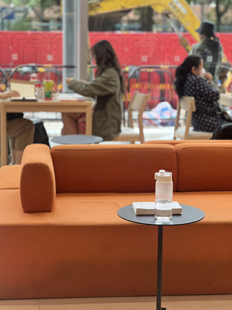 还有一处位置非常别致,那就是位于二楼落地窗前的一排橘色沙发。巨大的落地窗,可以远眺窗外生机盎然的春景,柔软的橘色沙发能完美承托每一个求知若渴者的身体,圆形小桌可以摆放电脑或书本,沙发后都有独立的台灯,既美观又能提供辅助光源。在这里,阅读变成了一种赏心悦目的美事。