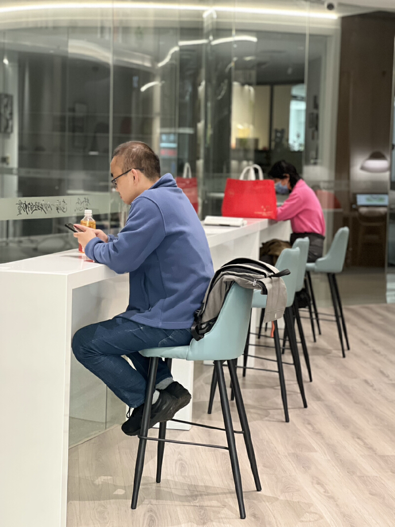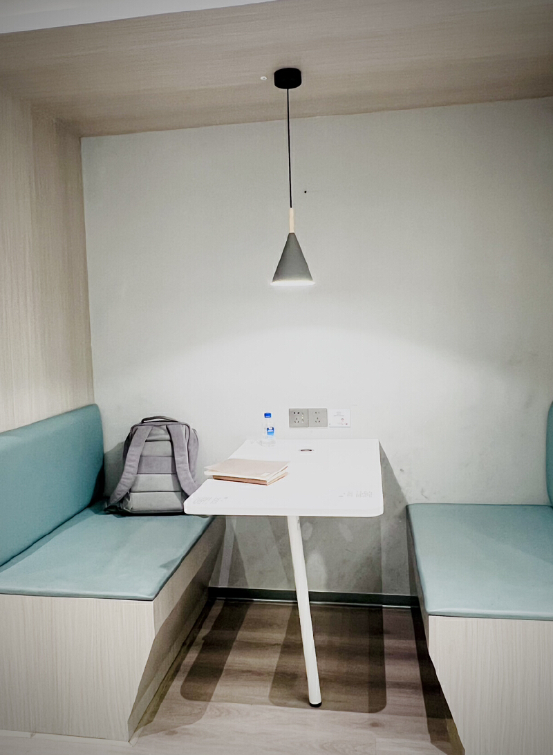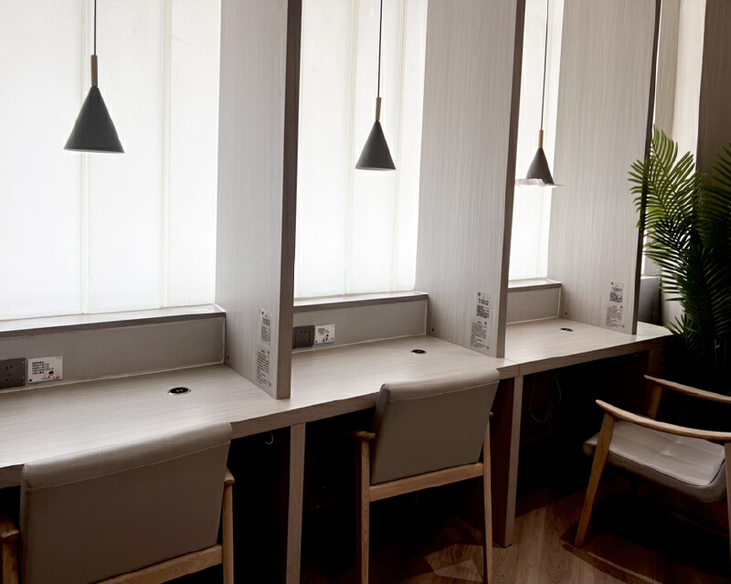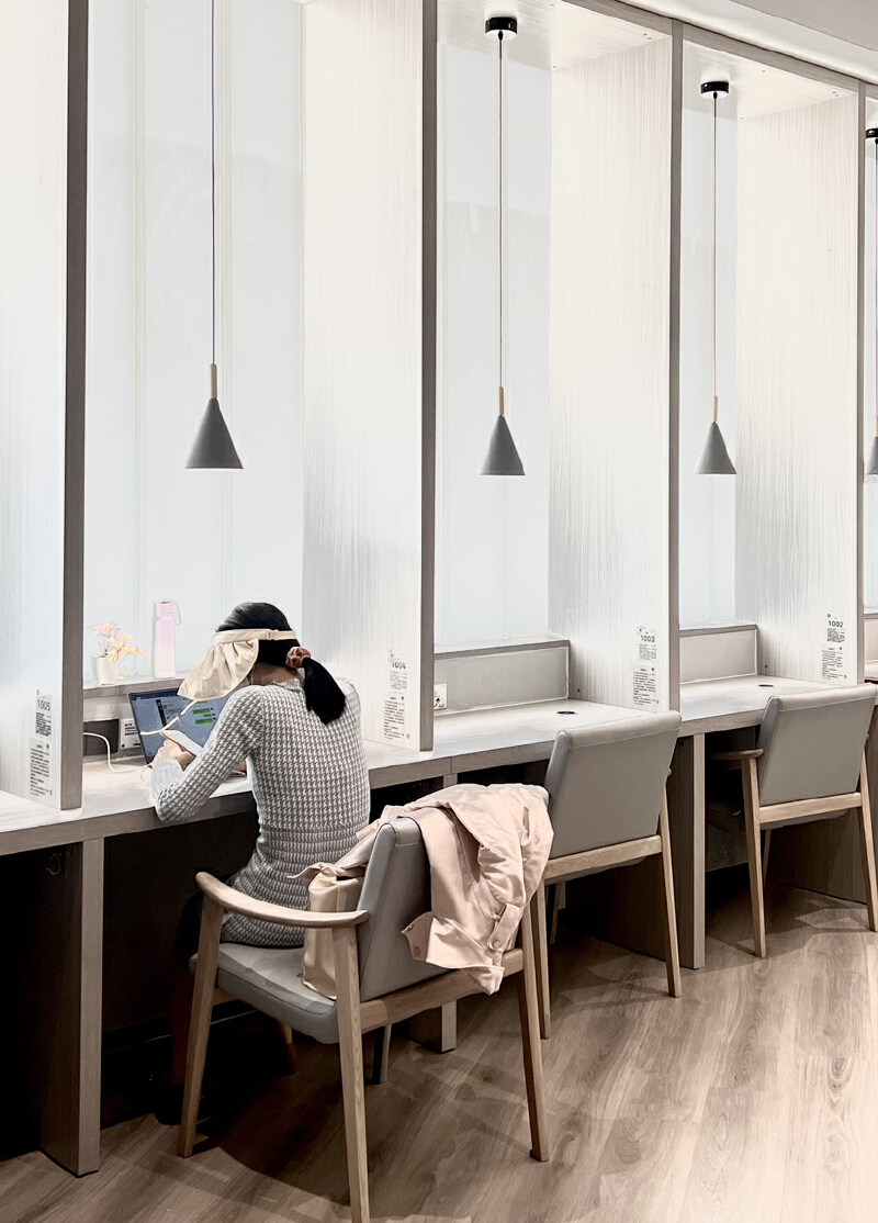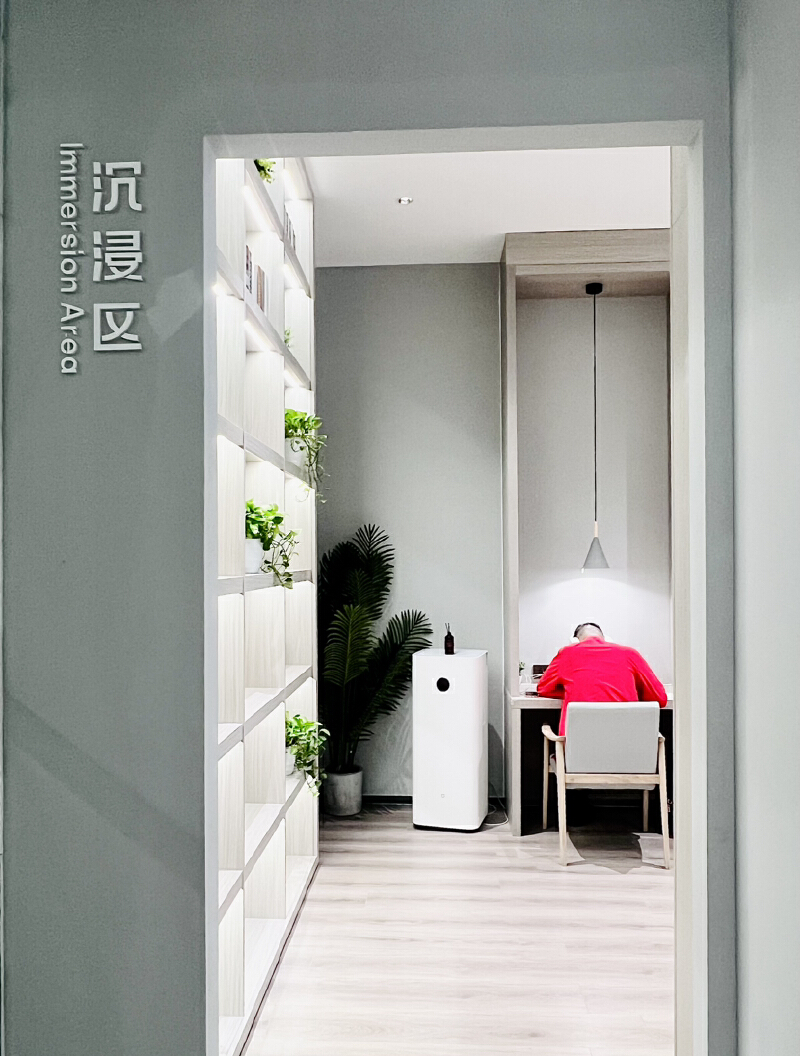 二楼有3个主要的自习区。其中,静思房是单人自习室,有12个位置,采用防窥式玻璃门,隐私性非常好,每次进入需要扫描预约码。