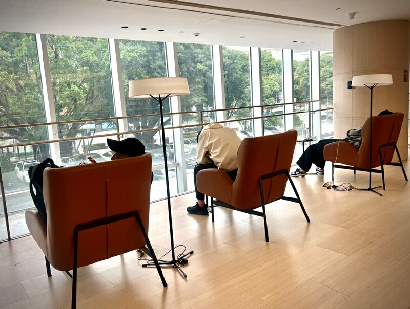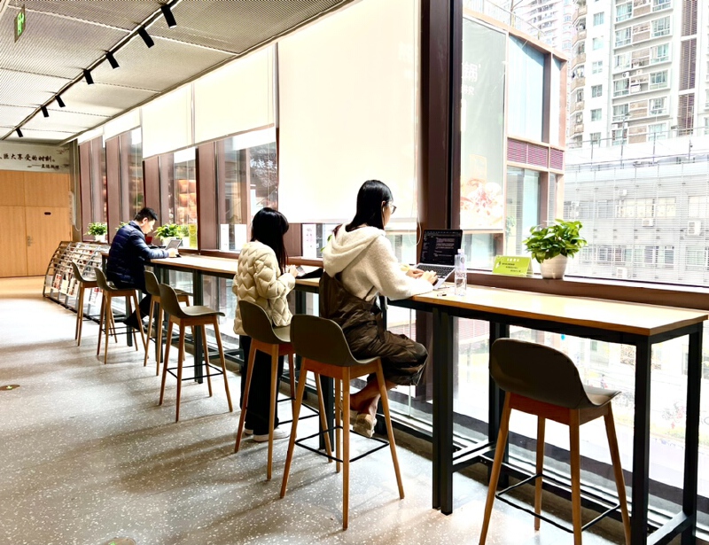 当你感到疲倦需要小憩时,自习室也为你贴心准备了一片休憩天地。这里不仅陈列有大量可供免费借阅的书籍,场馆一楼还有咖啡吧台,能买到香醇的咖啡,馆内更配备了打印机、饮水机、共享充电宝等一系列便利设施,堪称家门口的全方位“学习搭子”。