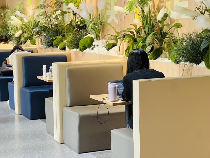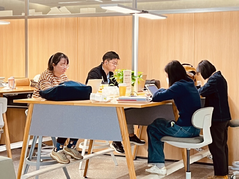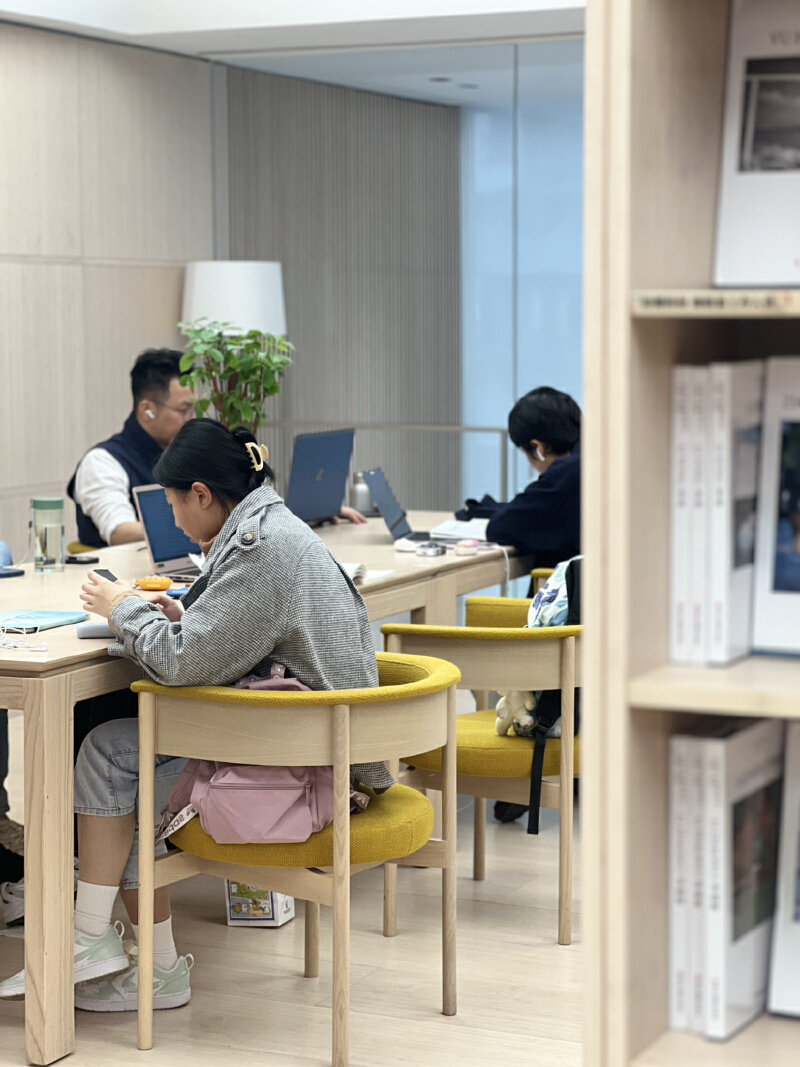 交流区开阔宽敞,分为卡座和长桌两种布局,适宜多人团队共享知识,开展深度探讨。而独立的讨论区则紧邻窗户,绿意盎然的植物点缀其间,当阳光洒落,满室生机勃发。最为静谧的无疑是沉浸区,这里都是单人座位,大家环绕着长桌而坐,各自潜心研读,那份无声的努力仿佛都融入了空气之中,整个区域都弥漫着积极进取的氛围。