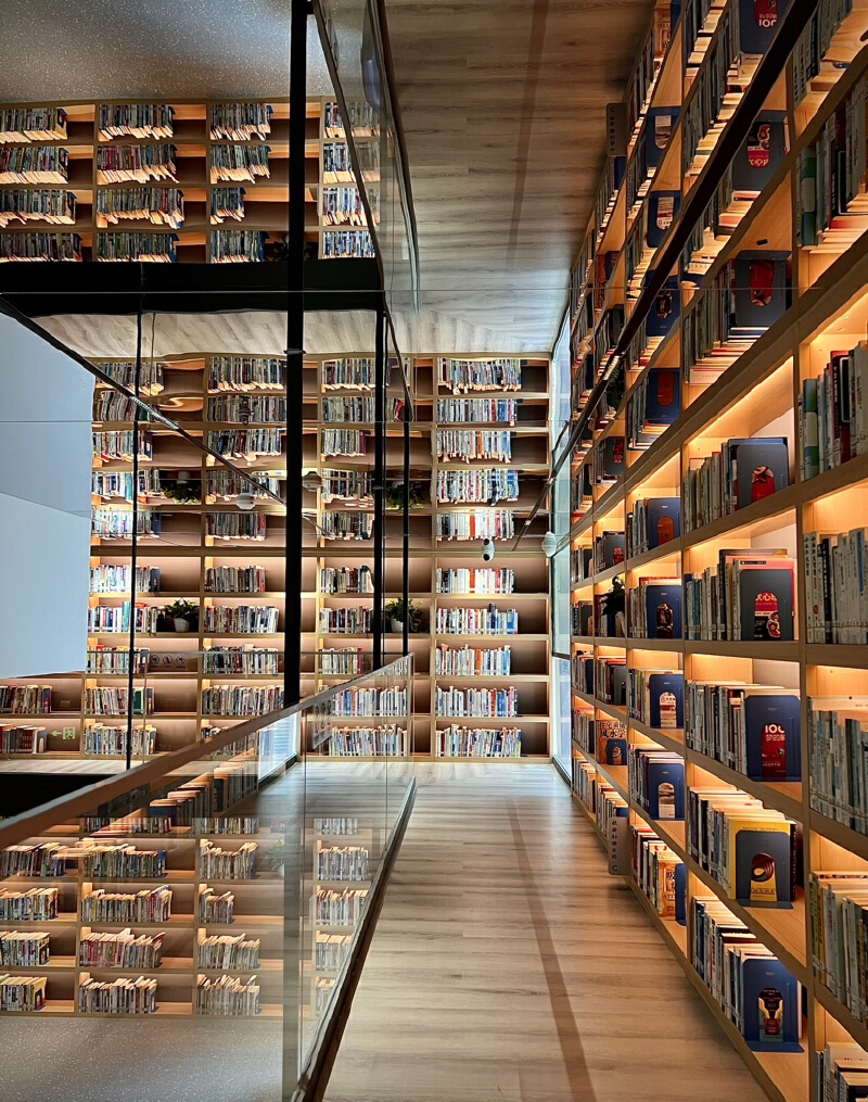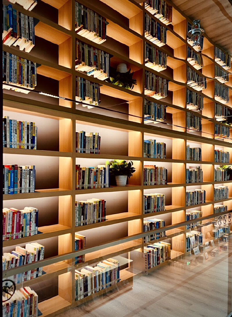 馆内最吸睛的莫过于一整面被橘黄色灯光笼罩的巨型书墙了。上千本书籍整齐地排列在其中,无论你是艺术爱好者,还是学术研究者,都能在这里找到自己需要的书籍,尽情享受阅读和思考的乐趣。书墙前还架了一条装着玻璃扶手的梯子,读者踏上梯子,便能一秒体验“行在书山中”的浪漫意境。