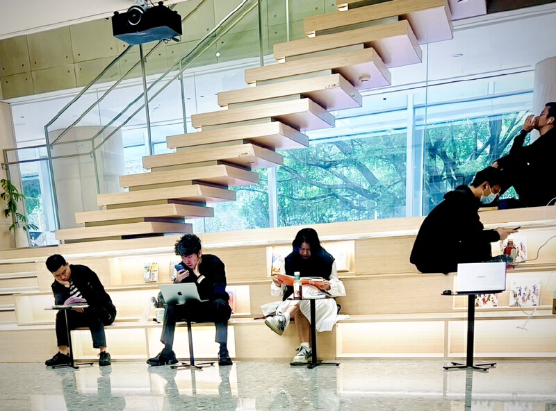 这里共分四楼,一楼是24小时阅读区和时习馆,配备有不同类型的座位,单人座、双人座、四人座,以及适合多人一起自习的环形桌都有配备。时习馆需要预约,其利用书桌隔断创造出一个个相对独立且私密的学习空间,每位在此学习的人既能感受到集体学习的氛围,又能保持必要的专注与宁静。