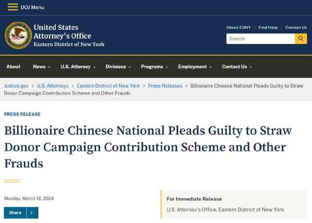 据美国纽约东区检察官办公室官方网站3月18日发布的新闻稿,中国籍亿万富豪覃辉承认了其以他人名义政治献金、移民欺诈和制作虚假身份证明文件的罪名。
