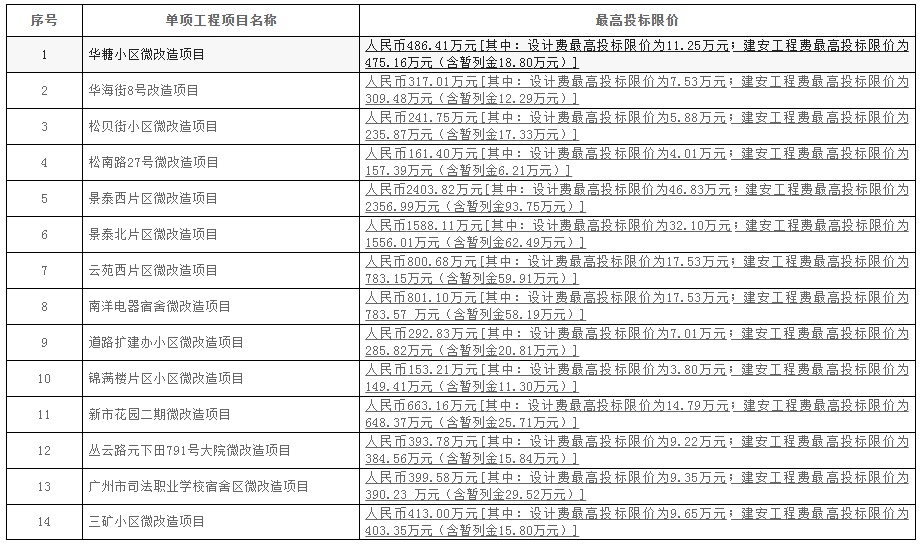 广州市白云区的广州市司法职业学校宿舍区老旧小区、松州街华糖小区、景泰西片区等14个老旧小区将启动微改造。近日,广州公共资源交易中心发布公告,拟对广州市白云区的这14个老旧小区微改造项目设计施工总承包进行公开招标,选定承包人。