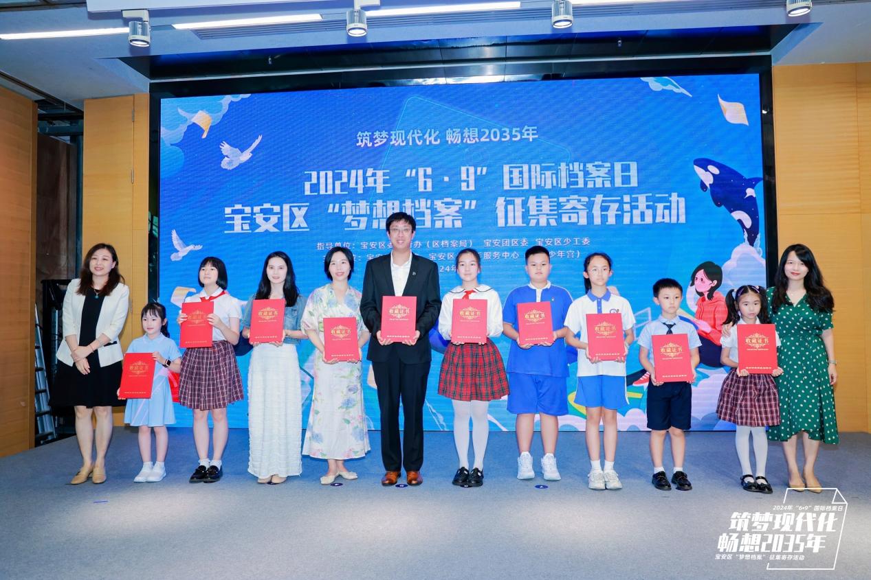 6月6日下午,“筑梦现代化 畅想2035年”梦想档案征集寄存活动收藏证书颁发仪式在宝安区青少年宫举办。仪式现场为梦想入选作者代表颁发了宝安区档案馆档案收藏证书,入选作者中的香港青年代表及优秀学生代表上台发言,激发了大家奋力追逐梦想、爱党爱国爱家的情怀。活动现场,还安排有档案整理全流程的互动体验,让人们充分了解档案工作和档案文化。