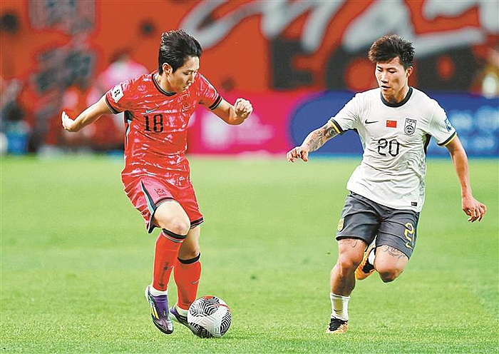 韩国队球员李刚仁(左)与中国队球员谢文能在比赛中拼抢。