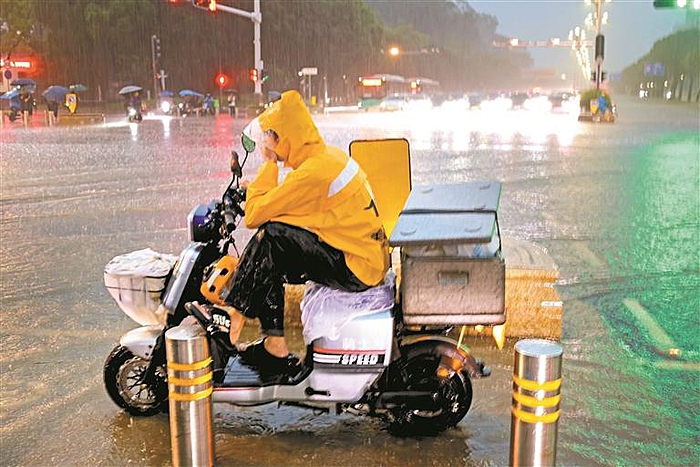 6月15日,新洲路和红荔路交会处,一名外卖员冒着大雨送餐,经历持续强降雨后,道路出现明显积水。深圳晚报记者 陈玉 摄