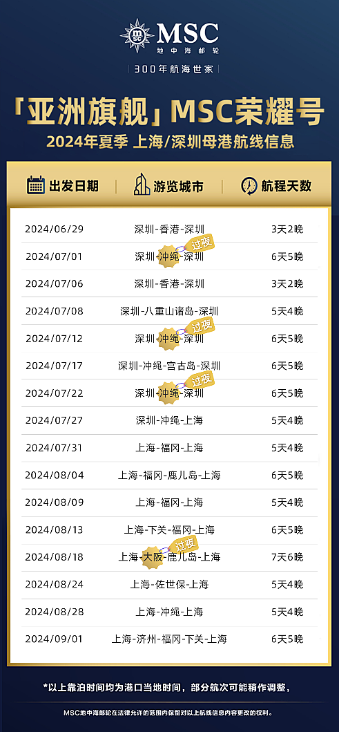 MSC荣耀号于2019年下水,是MSC地中海邮轮斥巨资打造的“传奇”级邮轮,不仅代表了全舰队的最高品质和标准,还是2024年整个亚洲吨位最大、技术最为先进的大型豪华邮轮。她的最大载客量为5,686人,总登记吨位达17.2万吨,共配备2,217间高品质舱房,广集美食、设计、奢享、居所、童趣、娱乐、科技、环保等八大旗舰级亮点于一身。继今年1月及3月登陆基隆、上海母港后,MSC荣耀号将在全新的暑期航季带来进一步升级的船上产品及设施,重点针对暑期家庭客群打造多种享受和丰富体验,于炎炎夏日,为粤港澳大湾区消费者带来更“邮”趣的清凉海上之旅。