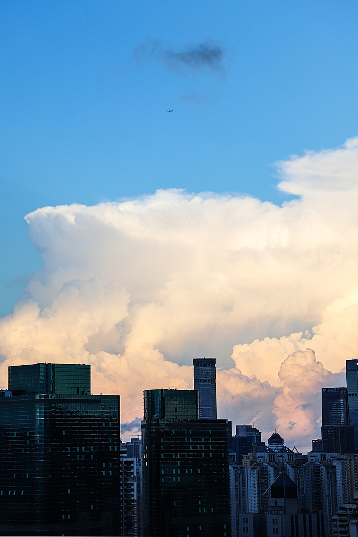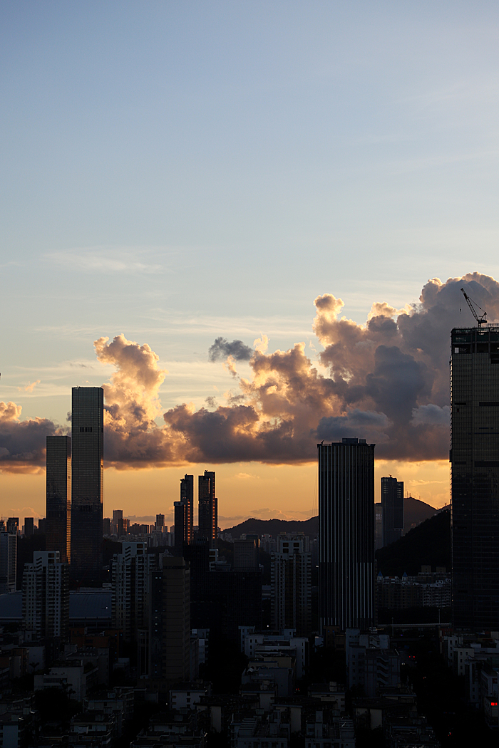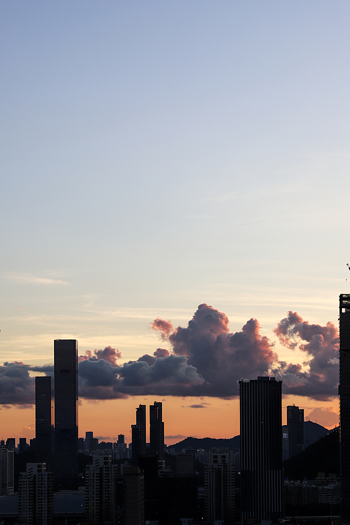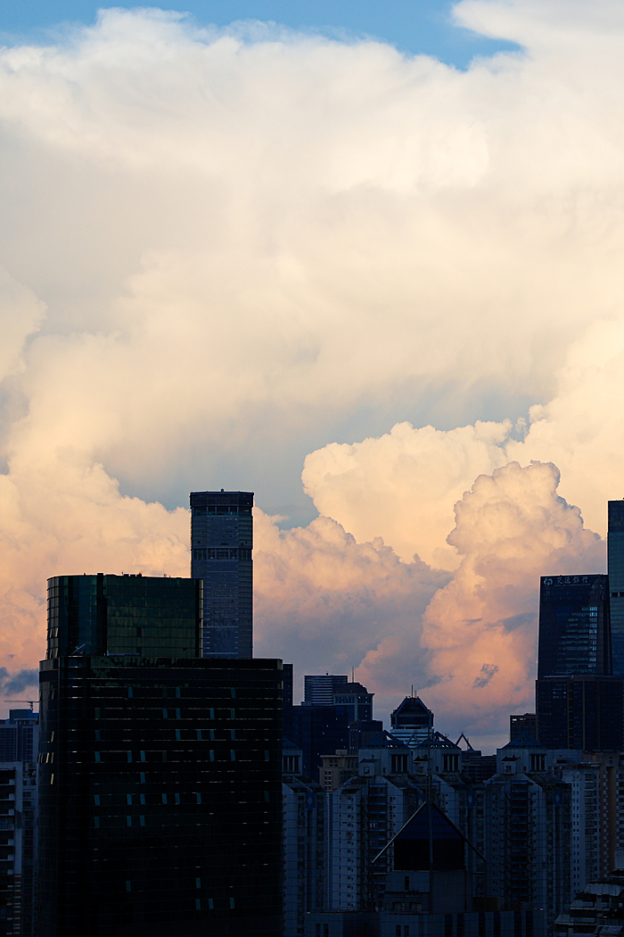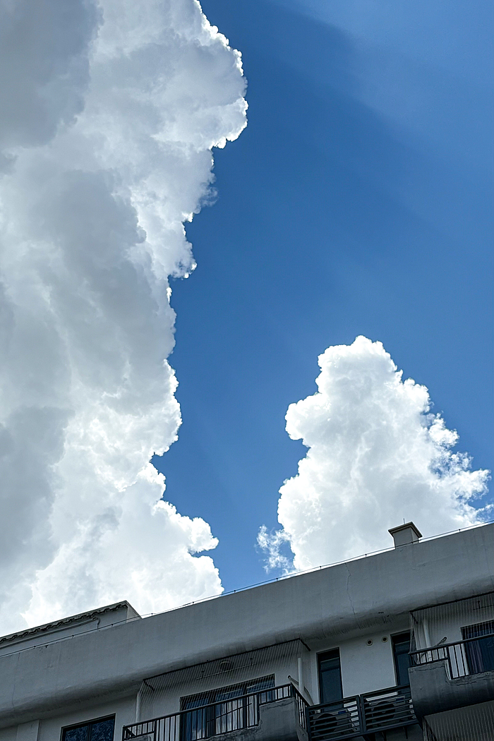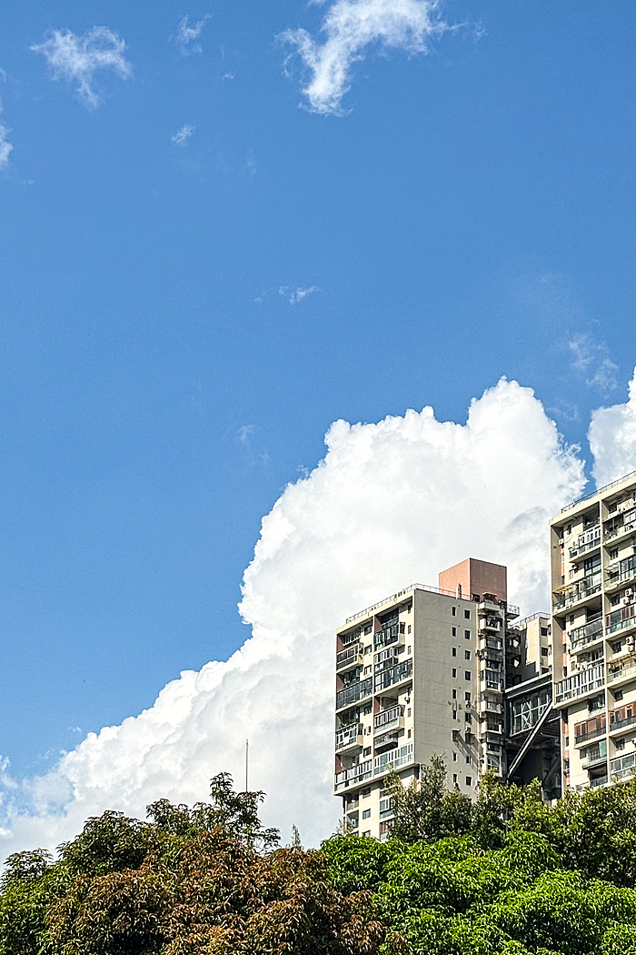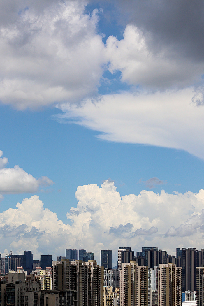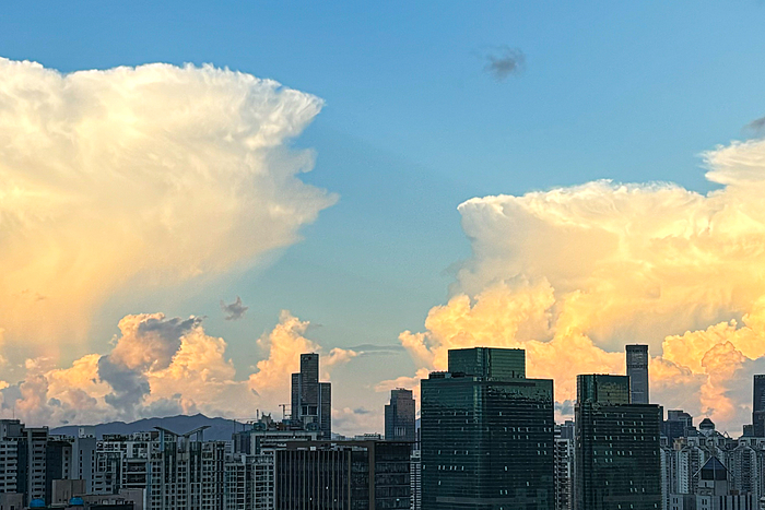 午后的深圳,天空常会变得更加戏剧化。炎热的阳光将海洋的湿润蒸腾成气,形成了壮观的积云。这些云彩堆积成山,厚重而深邃,顶部白得发光,底部则是暗沉的灰蓝色。