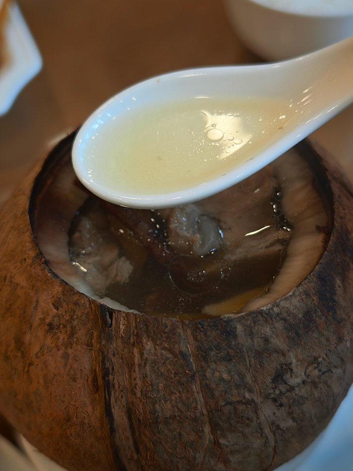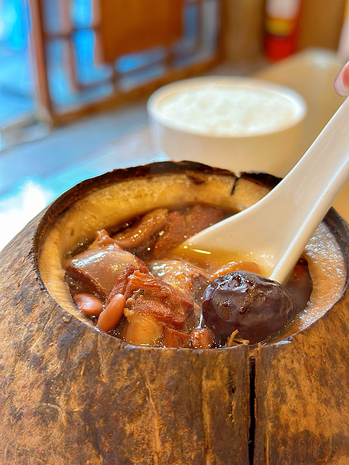 其中,椰子汤用整个海南椰子作为炖汤器皿,椰子汁做汤料,经过长达4-5小时的慢火炖煮,呈现出天然的清甜与鲜美,食材和火候一饮便知。