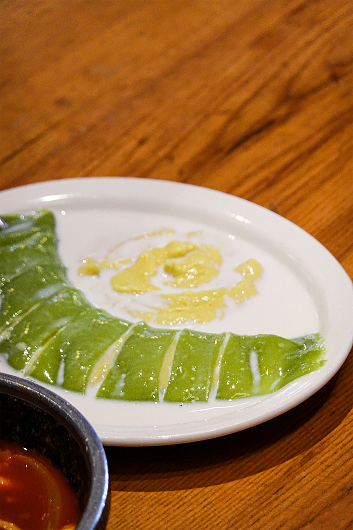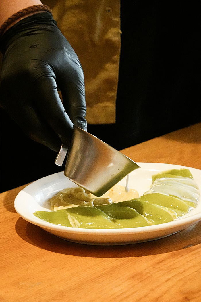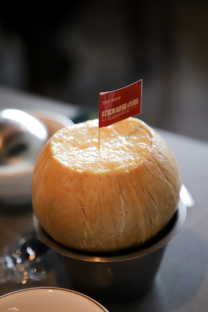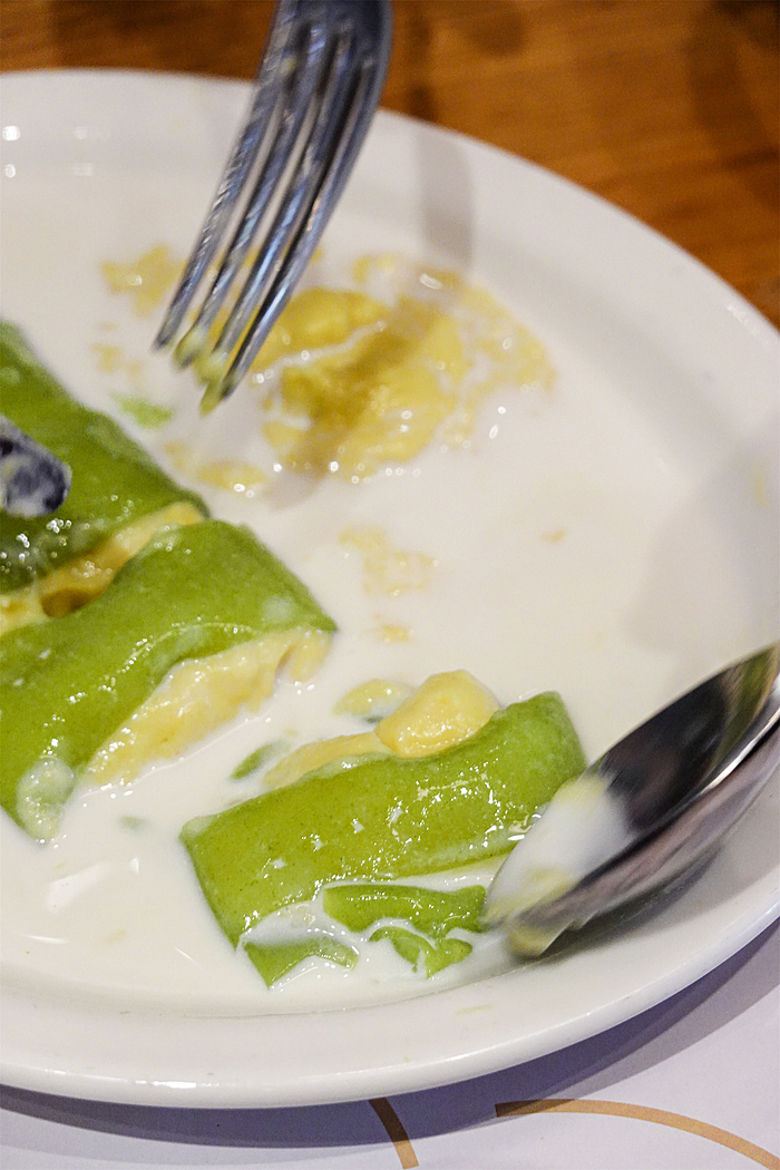 翠绿的斑斓叶汁染就的肠粉皮,给眼睛猛猛降温,而一抹热带气息四溢的“榴莲黄”闪亮登场,直接点亮了整道甜品的灵魂。
