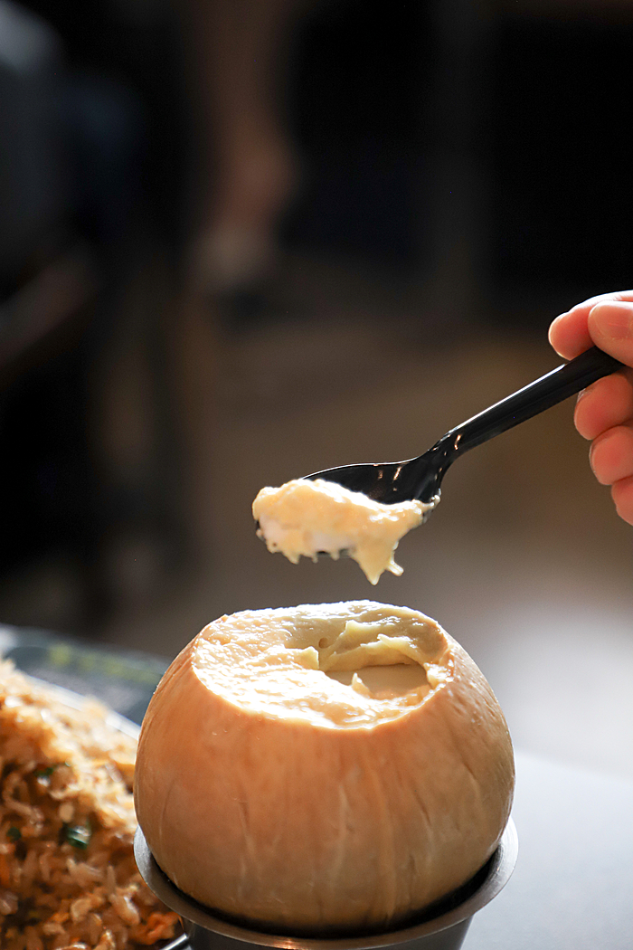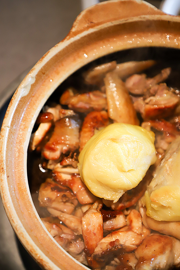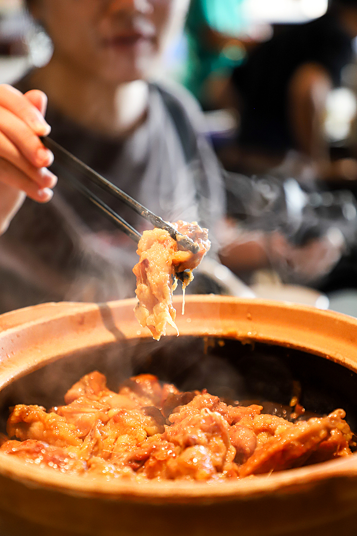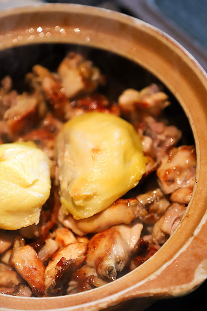 鸡煲一端上桌,就是榴莲和鸡肉的双重香气扑鼻。先把鸡肉煎得焦香,再淋上特制酱汁,然后放上两大块肉质丰厚的榴莲。