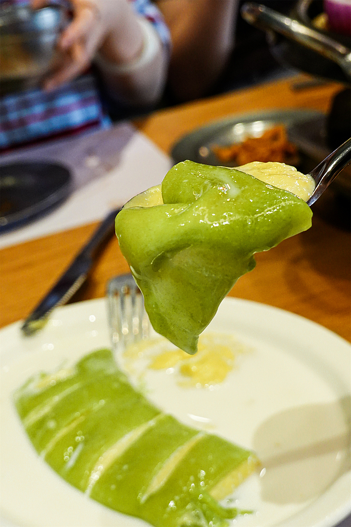 最近风很大的榴莲斑斓肠粉,一上桌就会吸引所有目光。