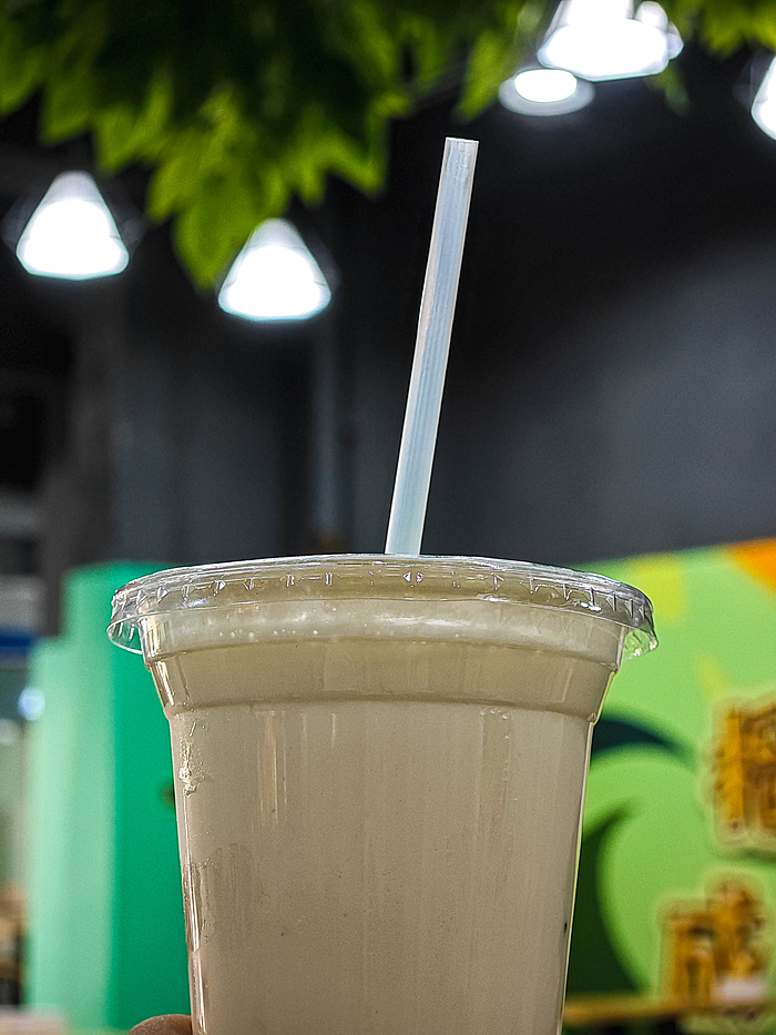 第一口喝下去,榴莲的香甜瞬间在口腔中绽放,与牛奶的醇厚相互交织,顺滑的口感中能品尝到些许绵软的榴莲果肉,榴莲与牛奶的组合,既不过分抢味,又相互衬托。