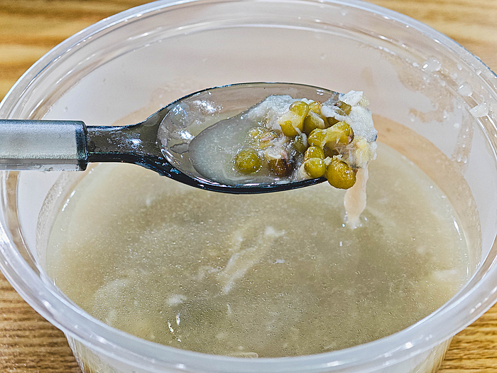 一口粥,享双重美味体验,吃的时候,稍微搅拌下,清甜榴莲果肉与绵密绿豆一同吸入,爽口又解腻。