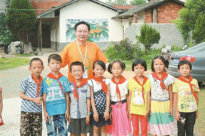 ▲2014年,郑钧在“思源之旅”活动中与当地受助学生合影。