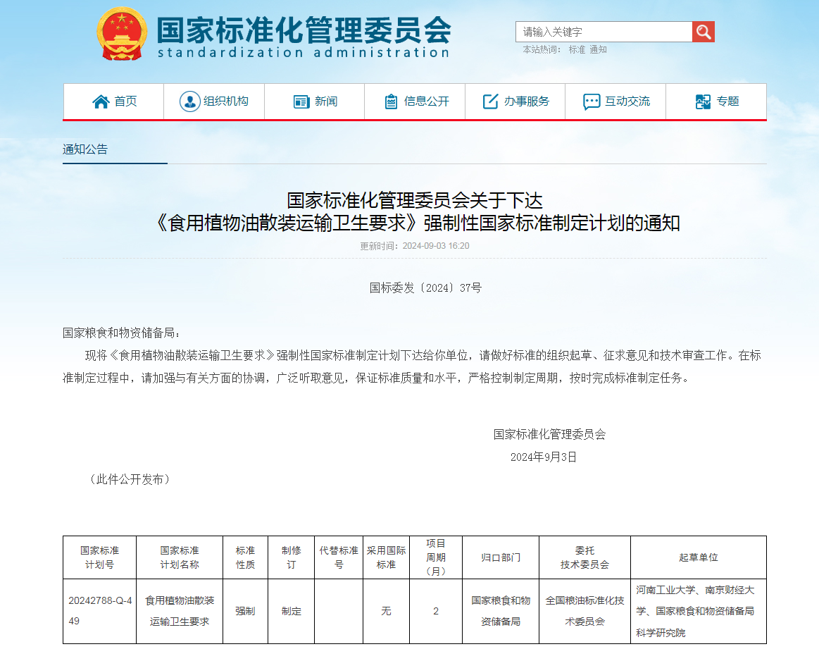 国家标准计划《食用植物油散装运输卫生要求》由国家粮食和储备局组织起草,委托全国粮油标准化技术委员会执行。主要起草单位为河南工业大学、南京财经大学、国家粮食和物资储备局科学研究院。
