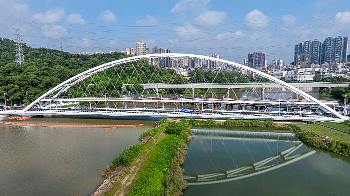 9月26日上午,位于罗湖区的大望桥新桥正式通车,不仅刷新深圳市内单跨跨度最大桥梁纪录,也是国内首座位于平曲线上的网状吊杆拱桥,同时也是国内首座不规则“桥上桥”。新桥更是连接大梧桐生态融合区的“彩虹纽带”,为片区发展注入了新的活力。