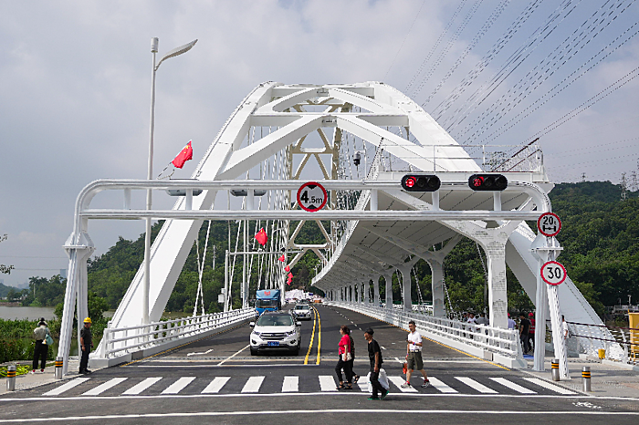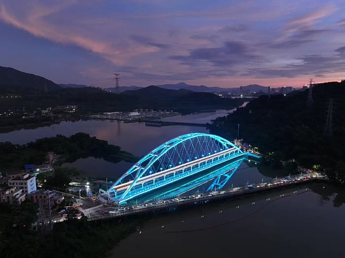 据了解,大望桥全长232.732米,主跨215米,桥宽20至22.5米。桥体结构采用网状吊杆拱桥设计,是国内首座位于座平圆形上的此类桥梁,其美观与功能兼备。双层桥面设计将极大提升交通的通行能力:下层由结构四车道和慢行通道构成,上层覆盖一条宽达6.5米的交通绿道,纵贯梧桐山和淘金山绿道,形成完整的环深圳水库郊野绿道,市民在步道上漫步,既可仰望苍翠欲滴的梧桐山峰,又能俯瞰碧波荡漾的深圳水库,“绿美罗湖”尽收眼底。