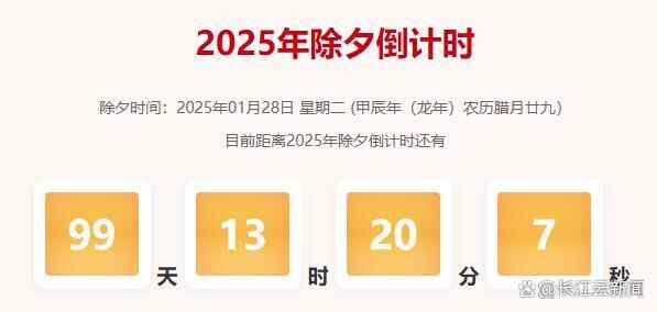 10月20日,距离2025年蛇年除夕还有99天,过年倒计时进入2位数。2025年除夕在1月28日,农历为腊月二十九,依旧是没有农历大年三十的除夕。一年的时间转瞬即逝,网友们纷纷感慨时间过得太快了。