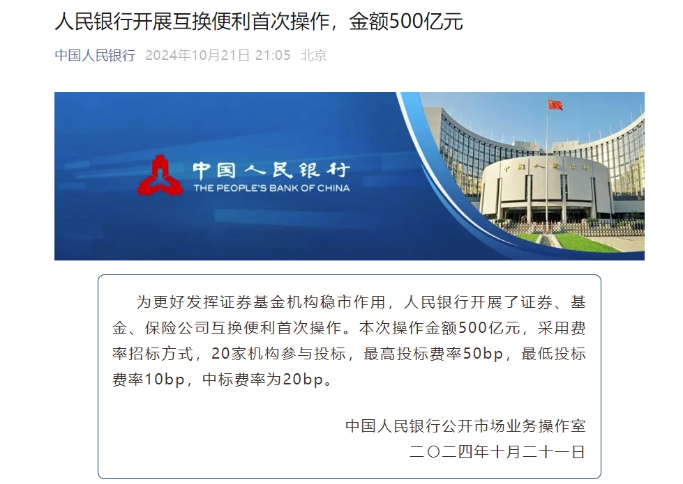 10月21日,中国人民银行发布消息称,为更好发挥证券基金机构稳市作用,人民银行开展了证券、基金、保险公司互换便利首次操作。本次操作金额500亿元,采用费率招标方式,20家机构参与投标,最高投标费率50bp,最低投标费率10bp,中标费率为20bp。
