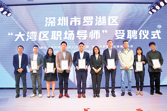 ▲周文乐(右四)获聘深圳市罗湖区首批“大湾区职场导师”。 资料图