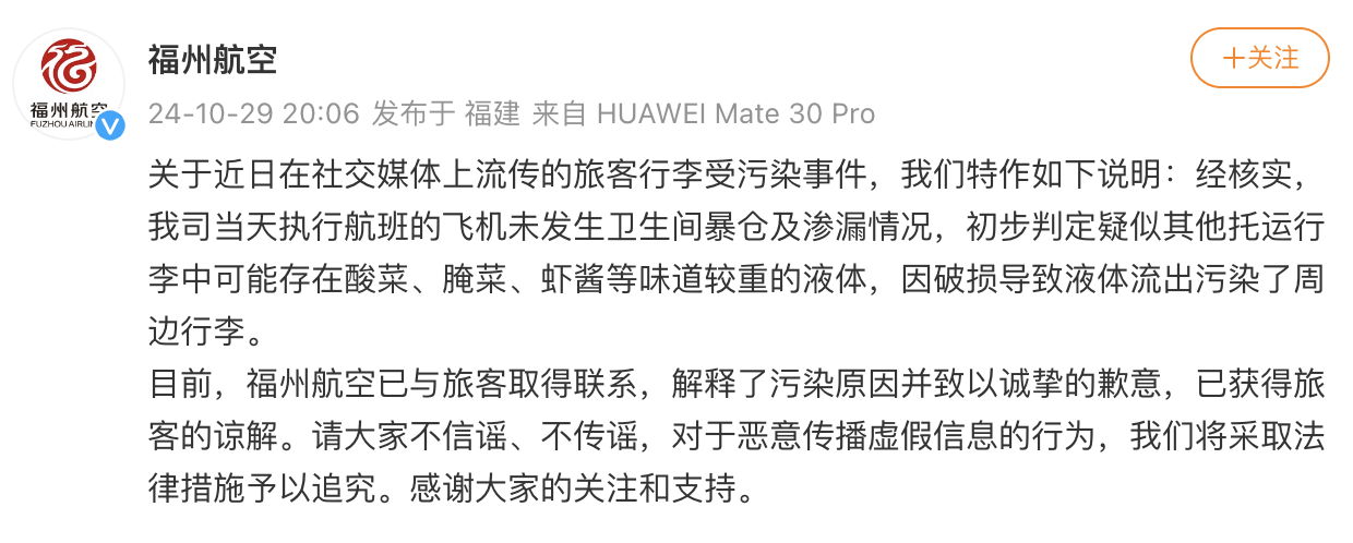 经核实,福州航空当天执行航班的飞机未发生卫生间暴仓及渗漏情况,初步判定疑似其他托运行李中可能存在酸菜、腌菜、虾酱等味道较重的液体,因破损导致液体流出污染了周边行李。目前,福州航空已与旅客取得联系,解释了污染原因并致以诚挚的歉意,已获得旅客的谅解。