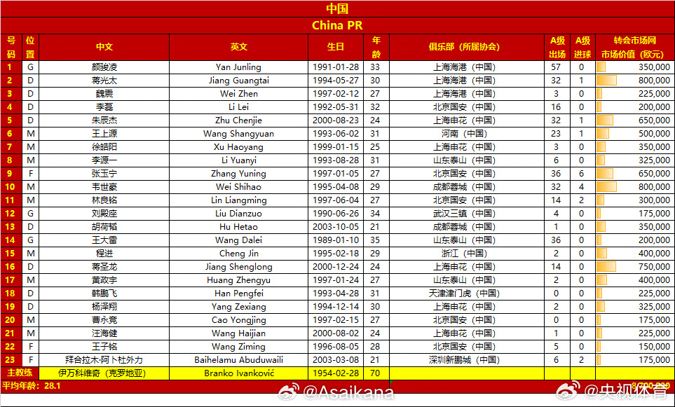 前锋:9-张玉宁(北京国安)、22-王子铭(北京国安)、23-拜合拉木(深圳新鹏城)