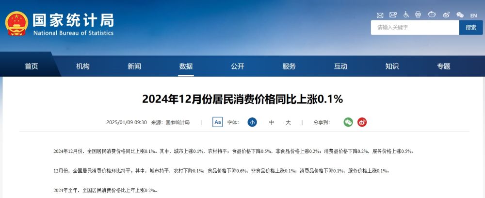 2024年12月份,全国居民消费价格同比上涨0.1%。其中,城市上涨0.1%,农村持平;食品价格下降0.5%,非食品价格上涨0.2%;消费品价格下降0.2%,服务价格上涨0.5%。