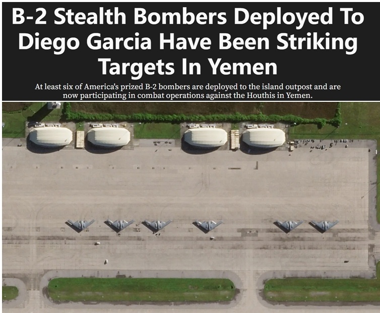 美国军事网站报道称,卫星图像显示,迪戈加西亚岛上至少部署了6架B-2轰炸机和6架KC-135加油机。消息人士称,最近三周,美军对胡塞武装的打击行动,耗费了大约10亿美元。
