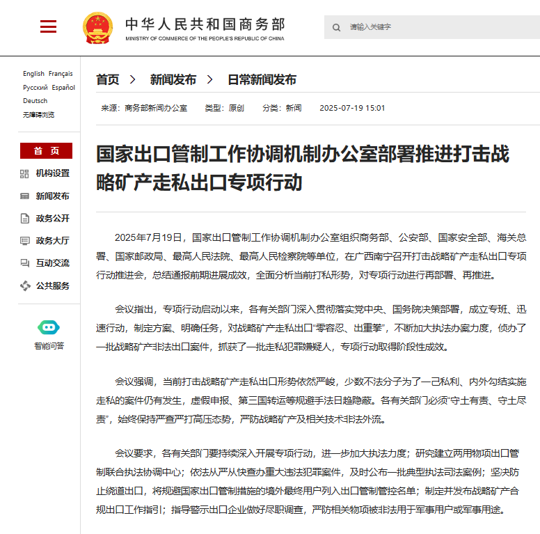 2025年7月19日,国家出口管制工作协调机制办公室组织商务部、公安部、国家安全部、海关总署、国家邮政局、最高人民法院、最高人民检察院等单位,在广西南宁召开打击战略矿产走私出口专项行动推进会,总结通报前期进展成效,全面分析当前打私形势,对专项行动进行再部署、再推进。