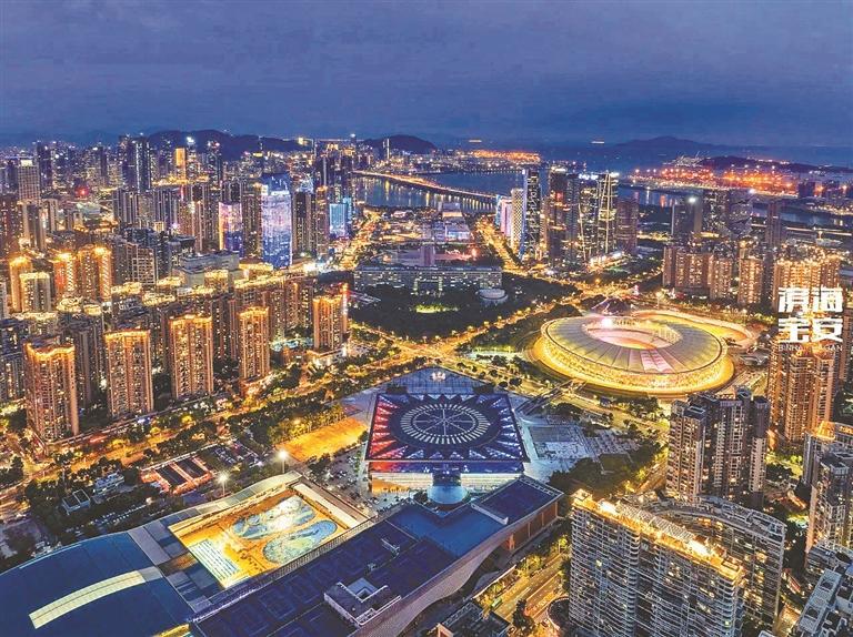 ▲8月1日即将迎来十五运会开幕式倒计时100天,有“竹林”之称的宝安体育中心亮灯扮靓宝安中心区夜景。童艳龙/摄