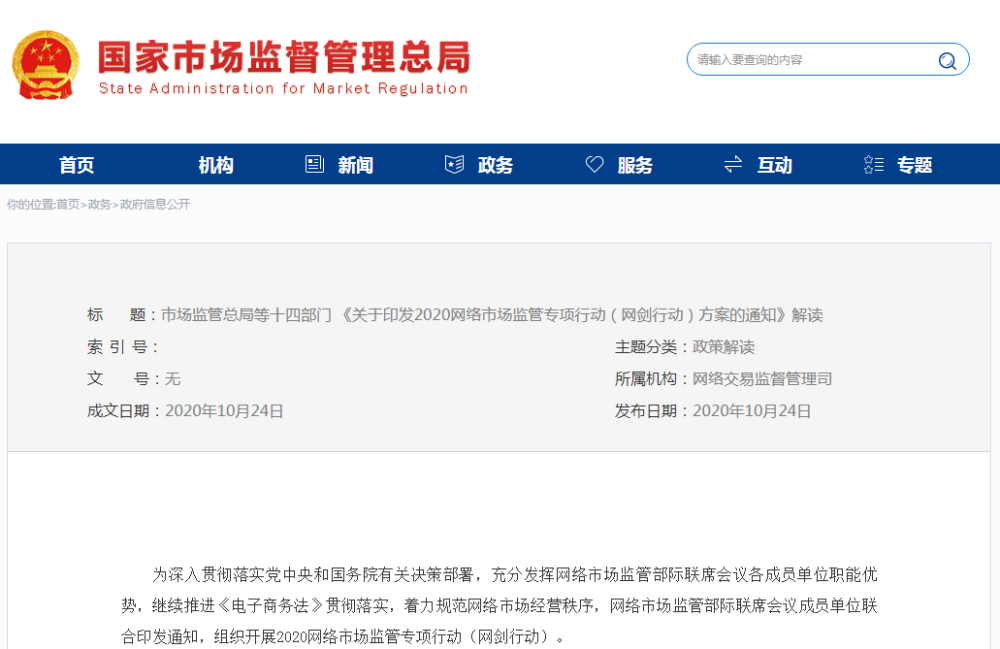 市场监管总局等十四部门 《关于印发2020网络市场监管专项行动(网剑行动)方案的通知》解读