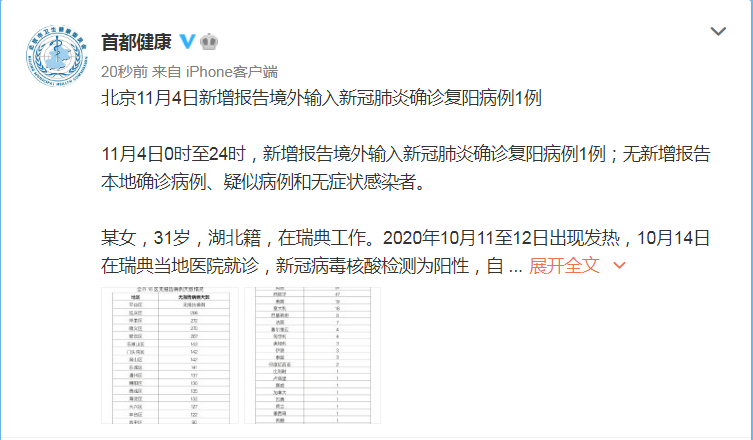 11月4日0时至24时,新增报告境外输入新冠肺炎确诊复阳病例1例;无新增报告本地确诊病例、疑似病例和无症状感染者。
