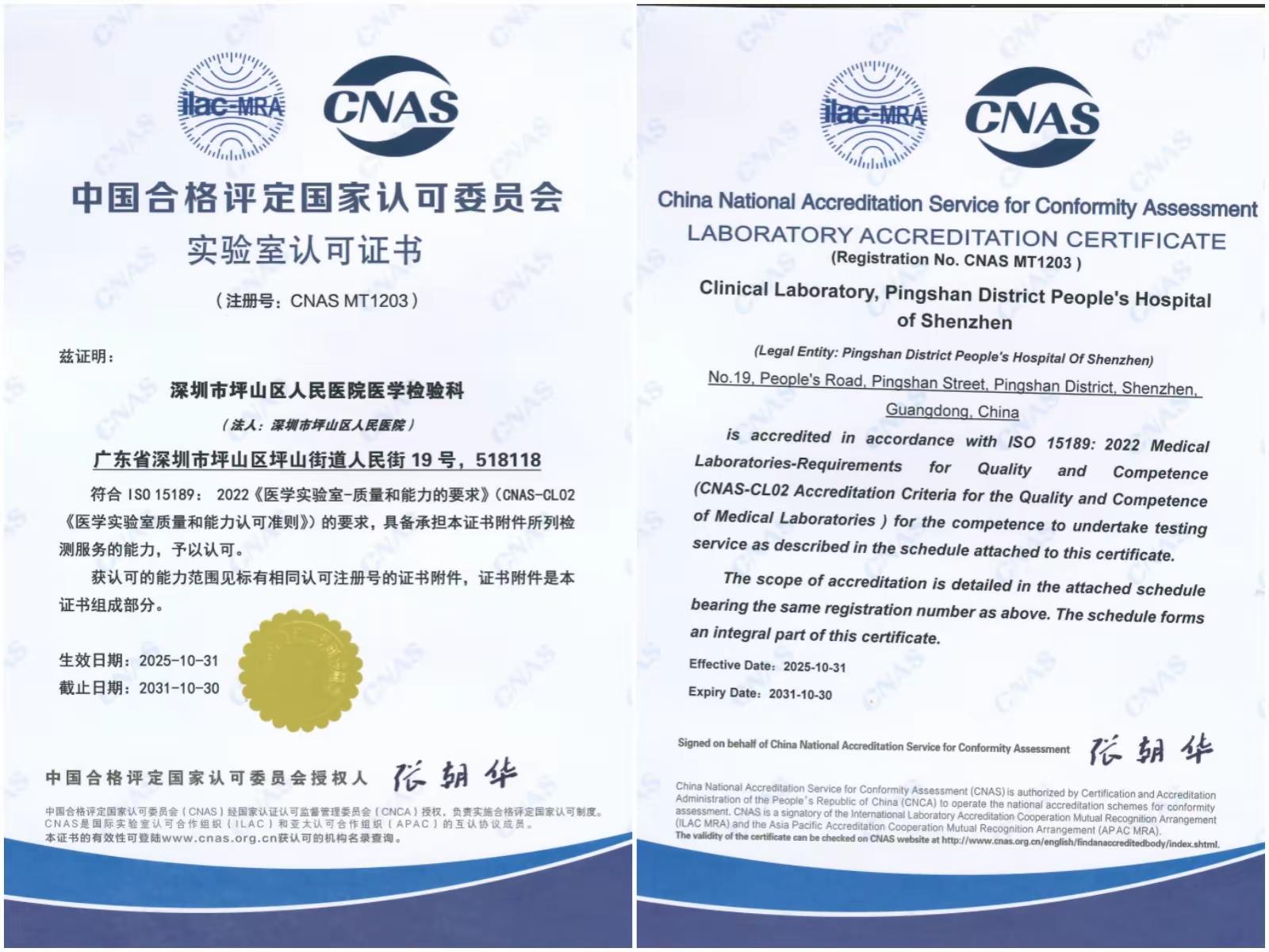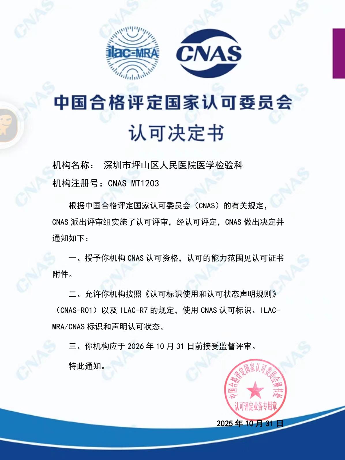 日前,深圳市坪山区人民医院医学检验科成功通过中国合格评定国家认可委员会(CNAS)ISO 15189医学实验室认可,获颁国家级认可证书(编号:MT1203)。这标志着该院检验科的质量体系与技术能力全面对接国际标准,成为坪山区首家通过该项国际认可的医疗机构。