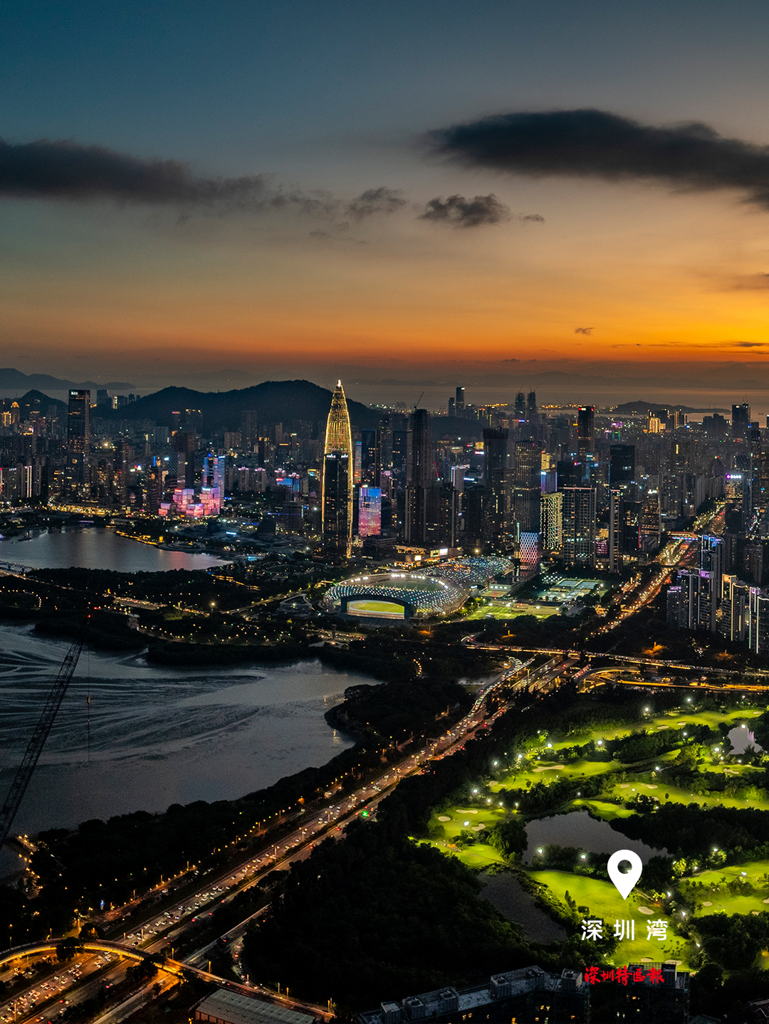 深圳湾畔,天际线被绚烂晚霞温柔拥抱,云朵被镀上了一层梦幻的光辉,城市灯火初上,深圳湾畔的高楼群在夜色中熠熠生辉,勾勒出都市的繁华与活力。