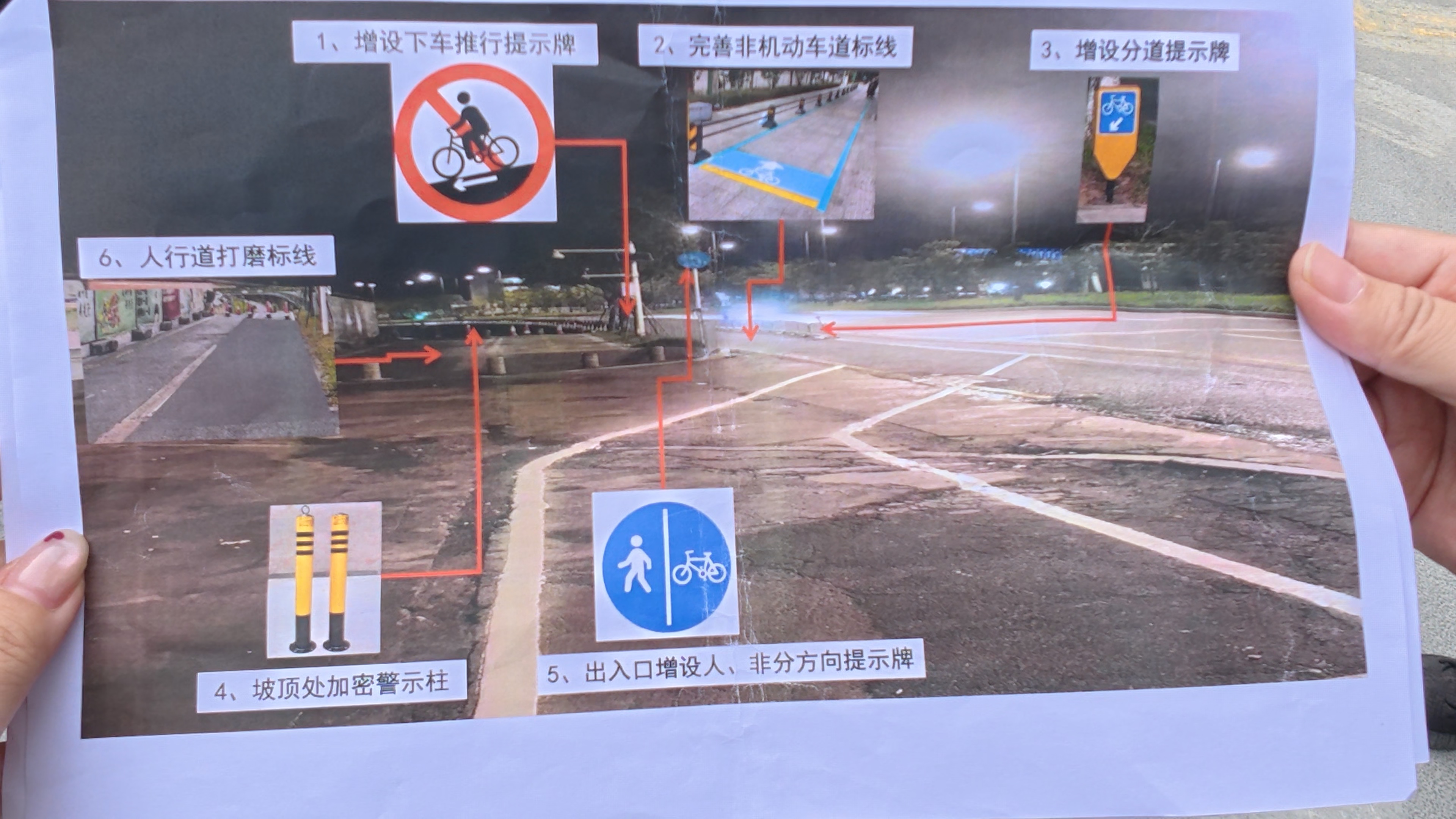 深圳市交通运输局宝安管理局养护监管科科长刘明明表示,目前整改工作正有序推进,除已增设的路面提醒标识及警示牌外,后续还计划在10天内完成推坡道加宽施工,进一步保障市民推行车辆下坡时的通行安全。