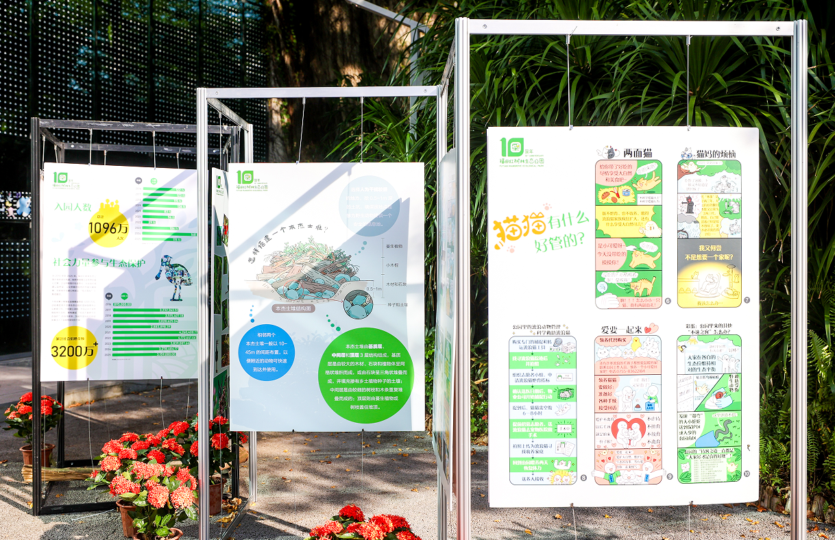 活动展示了生态公园十年来践行生态文明的自然教育系列成果,包括公园的生物多样性友好设施、公园十周年大事件、华南珍稀物种手绘图片展等。以活泼的图文内容介绍公园防鸟撞玻璃幕墙改造、鸟类友好型路灯的研发落地、外来物种清理和本土红树复种等内容。