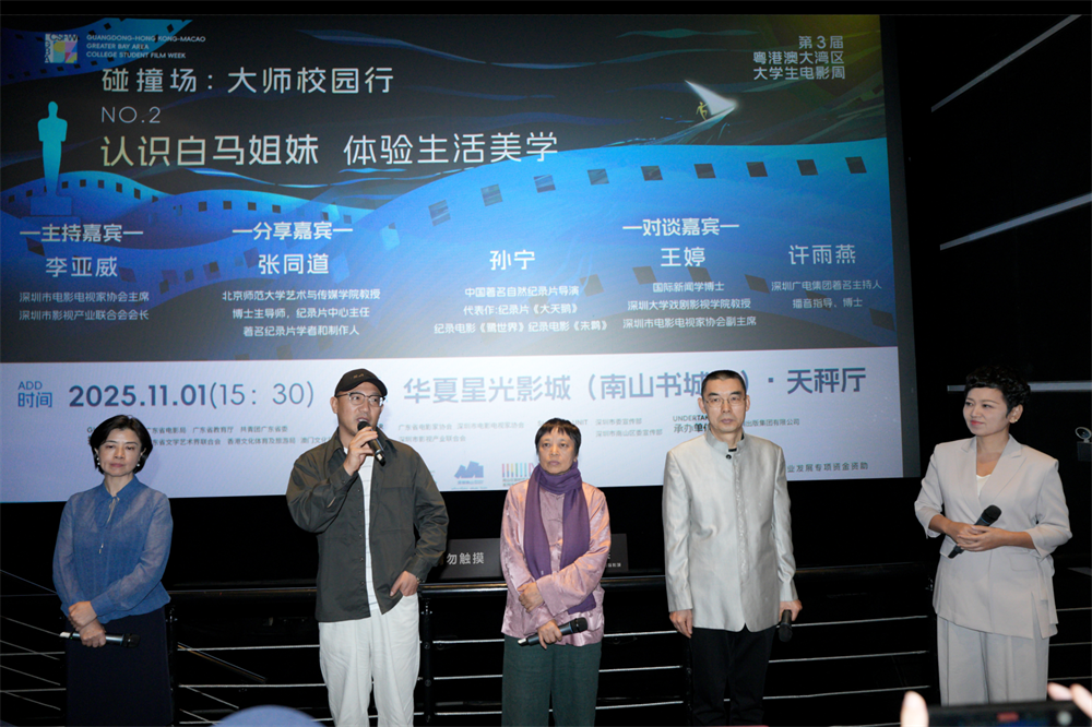 观影结束后,由李亚威主席主持分享会,《白马姐妹》导演、北京师范大学艺术与传媒学院教授张同道,中国著名自然纪录片导演孙宁,深圳大学戏剧影视学院教授王婷,深圳广电集团著名主持人、主任播音员许雨燕共同围绕影片展开深度对谈。