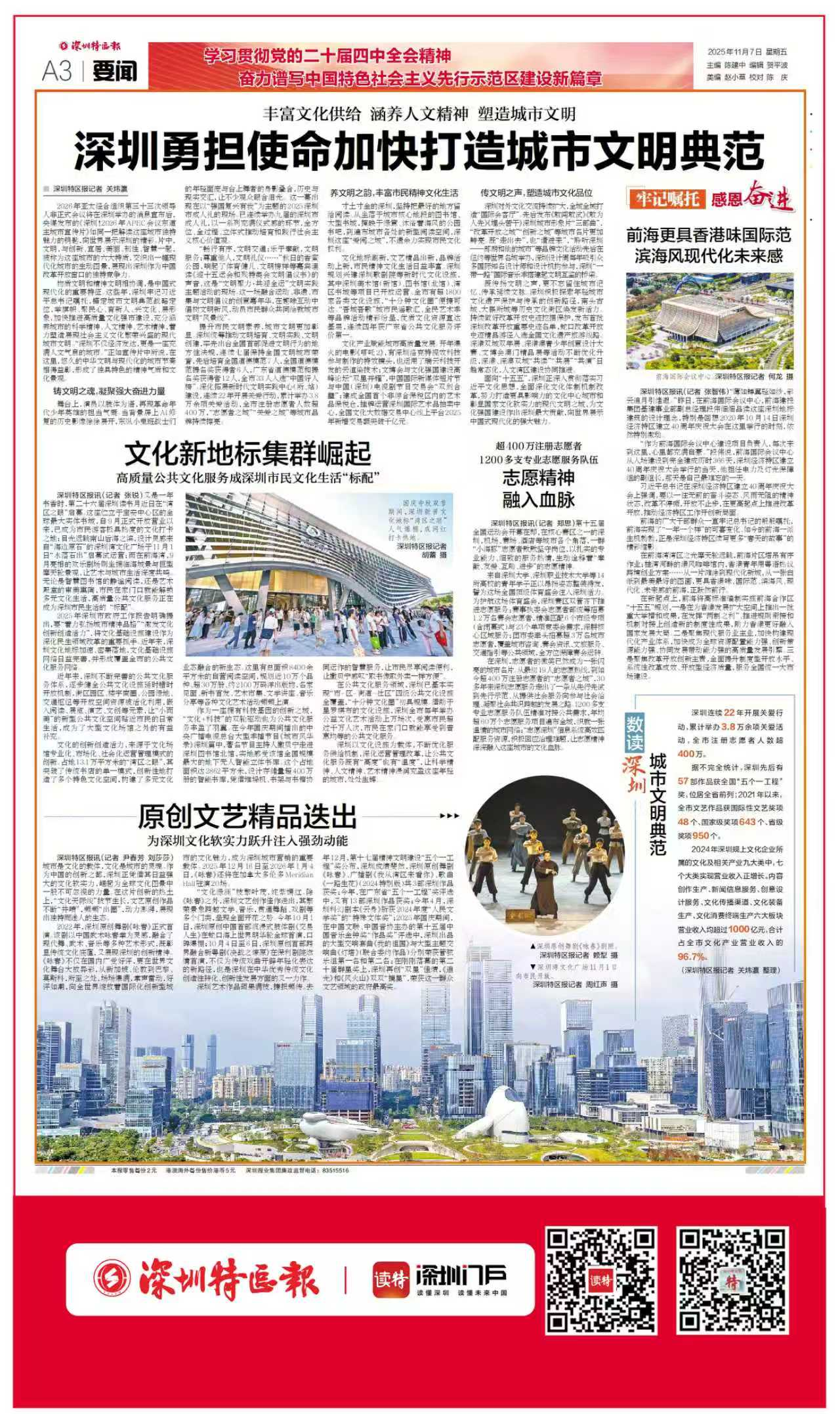 面向“十五五”,深圳正深入贯彻落实习近平文化思想,全面深化文化体制机制改革,努力打造更具影响力的文化中心城市和彰显国家文化软实力的现代文明之城,为文化强国建设作出深圳最大贡献,向世界展示中国式现代化的强大魅力。