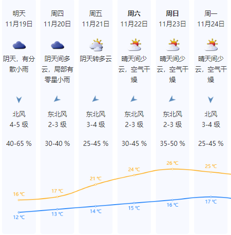 19-20日阴天有分散小雨,其中19日气温12-16℃,偏北阵风6-8级,个别高地9级左右,体感阴冷;