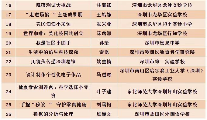 深圳入选的26节课程主题丰富、形式多样,既有关注校园与社区的观察、探访类课程,如《降落测试大挑战》《我是社区小助手》《带着问题去秋游——深圳鲲鹏径徒步考察探究》,也有围绕科学探秘、环保创意和生活健康的探究性课程,如《微型宴席:解码蚂蚁的食物密码》《数据的分析与处理》《家医健康膳食计划》《环保收集船模型设计与制作》等,充分体现了深圳学校对学生综合素养培养的系统探索。
