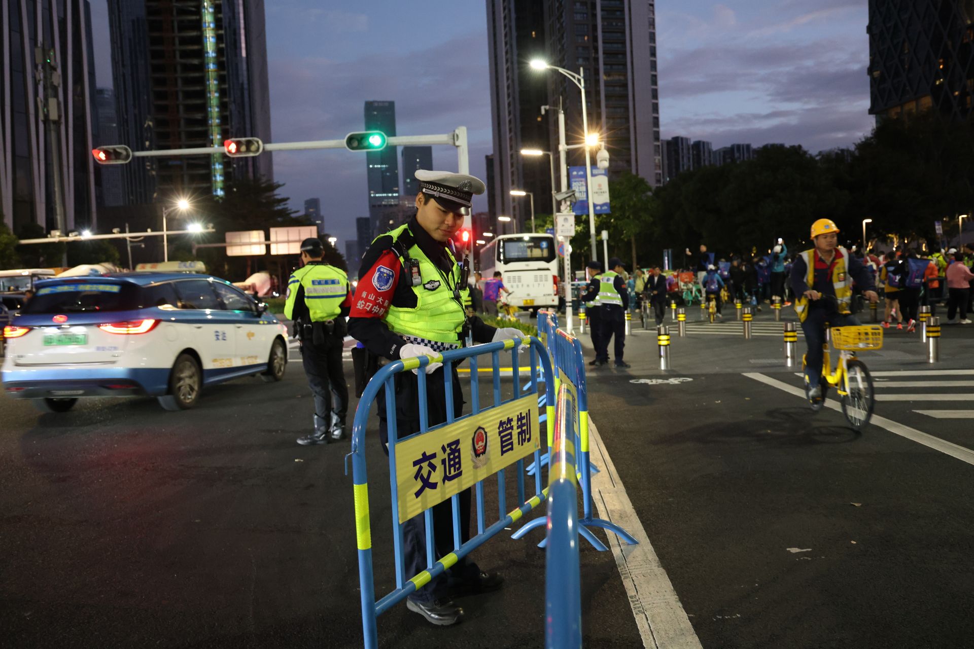 12月14日,南山半程马拉松开跑,深圳交警启用50台无人机规模机群开展交通保障。