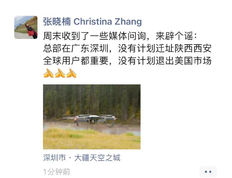 9月18日下午,针对这一传闻,大疆高级企业战略总监兼新闻发言人张晓楠在其朋友圈进行辟谣,表示:“总部在广东深圳,没有计划迁址陕西西安;全球用户都重要,没有计划退出美国市场。”