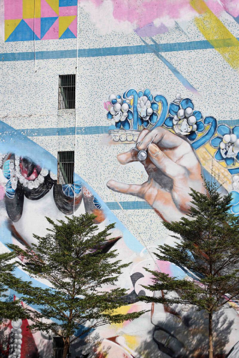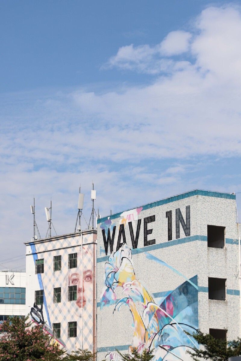 浪静路大道旁,原本朴素的外墙上绘制着一大片浅蓝色调的涂鸦创作,行人可驻足于石凹工业园区外侧,静静地观赏这些惊艳的“壁画”。