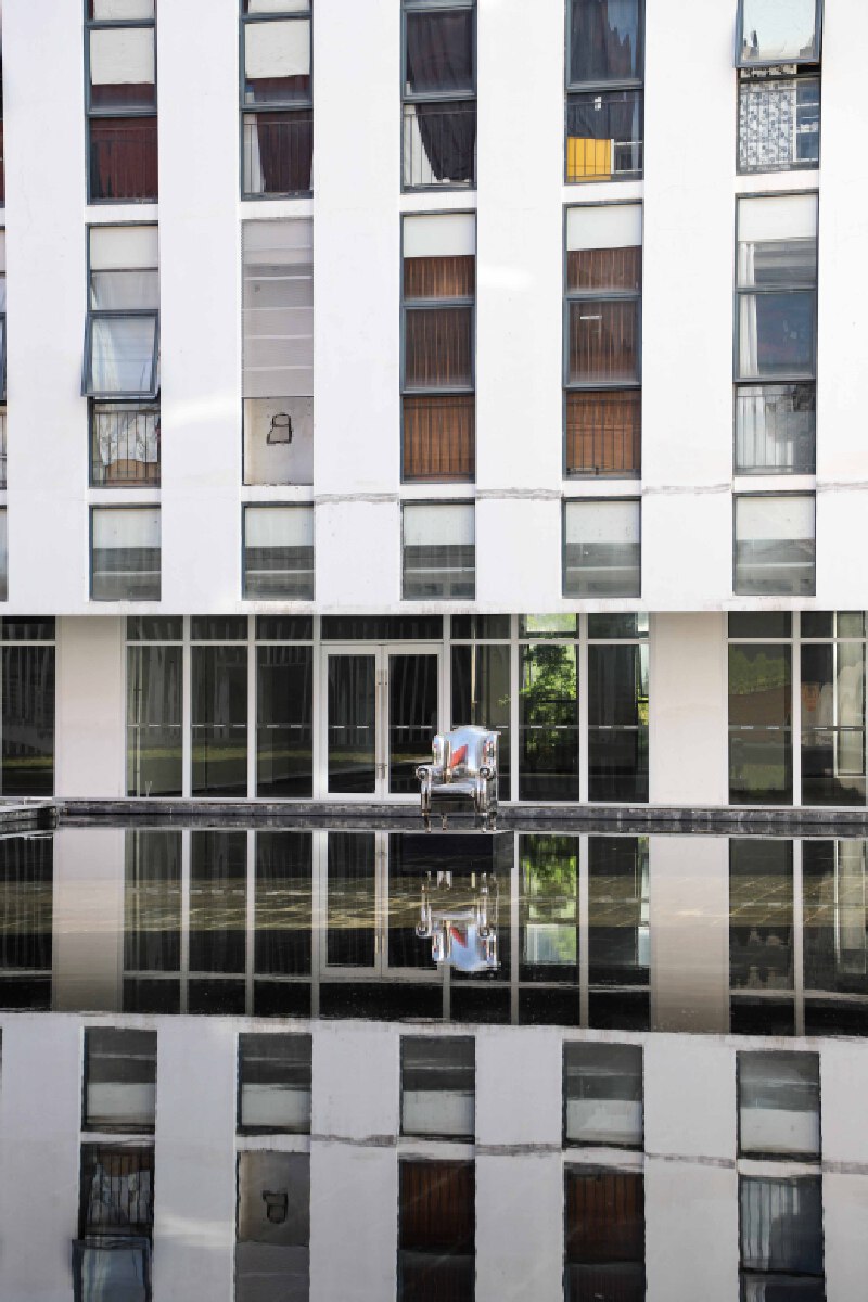 在黑与白的纯粹光影下,运用池塘水与金属沙发的材质进行对比,展现出人性品格中外柔内刚的精神力量。