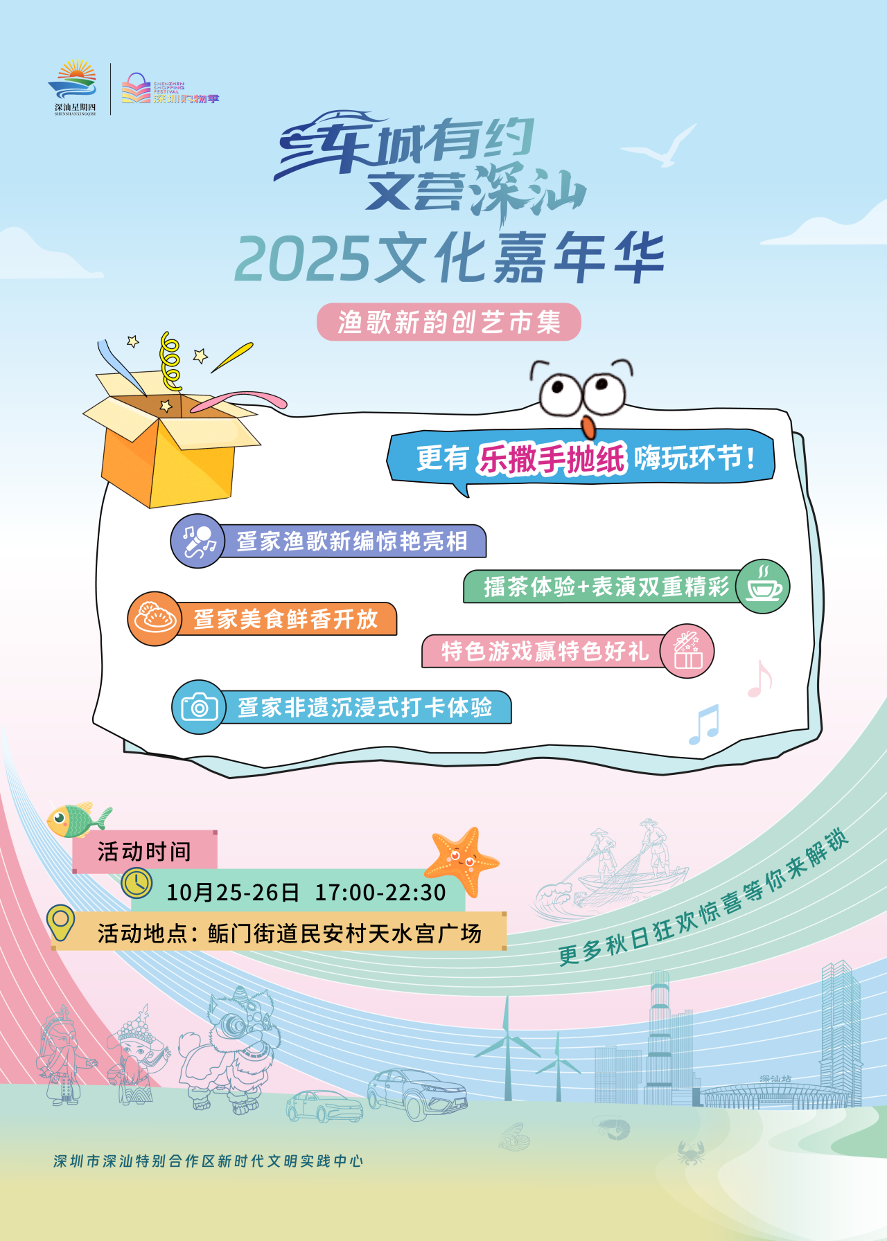 10月25日至26日每天17:00至22:30,“车城有约 文荟深汕”2025深汕文化嘉年华暨渔歌新韵创艺市集将带领市民游客沉浸式体验疍家文化的魅力,感受重阳时节的温暖情谊。